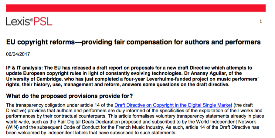 LexisPSL 'EU copyright reforms—providing fair compensation for authors and performers', interviewed by Janine Isenegger, Lexis Nexis, 6/04/17.